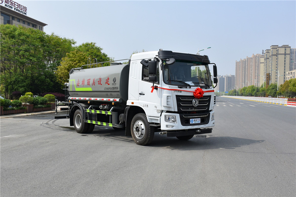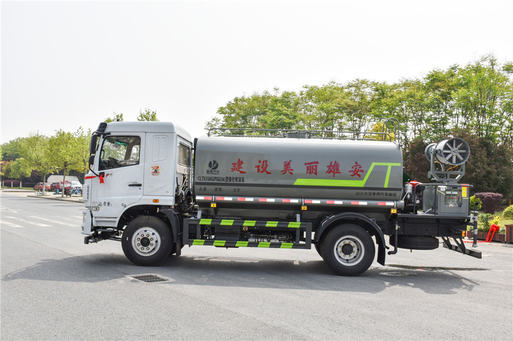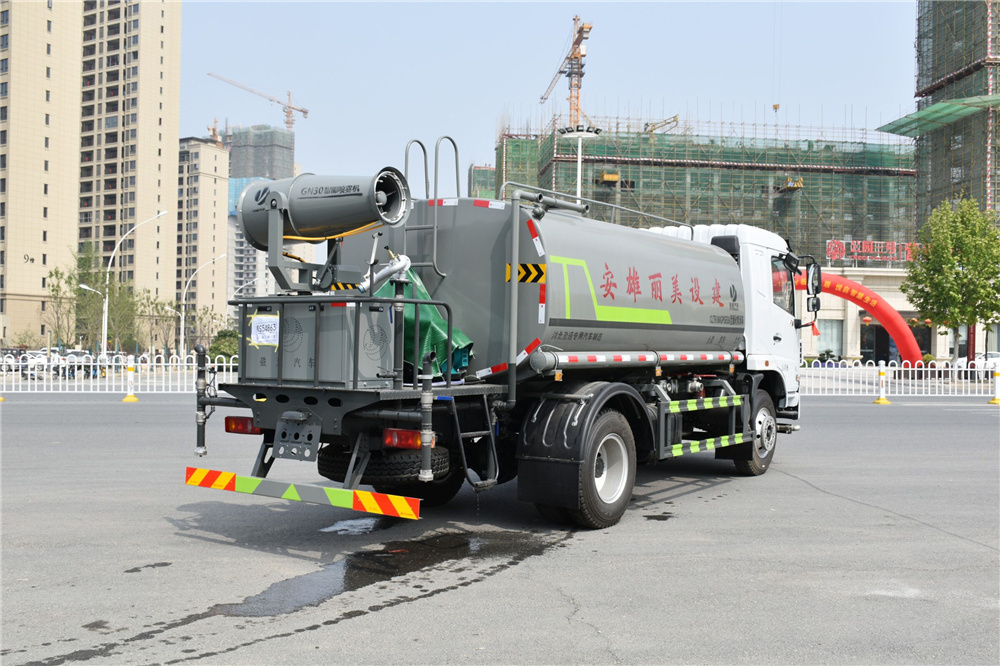 灑水車專用功能配置:罐體實際容積約為12立方米,(罐體有效參數(shù)9.79立方米、額定載質(zhì)量9325kg、)采用武鋼優(yōu)質(zhì)碳鋼板卷壓成型。配備專用灑水泵,自吸自排,前噴后灑、側(cè)噴、后工作平臺及灑水高壓炮。灑水泵自吸高度為6米左右,整車灑水寬度14米左右,后工作平臺水炮可調(diào)成:直沖狀、大雨、中雨、小雨、毛毛雨,有效射程≥28米,整車帶接頭、水位計,自流閥。后工作平臺主管路帶1寸澆花接口,附送2根3米水管,1個爬梯,兩側(cè)及后保險杠。