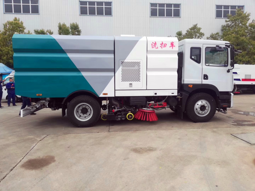 1)該車(chē)集掃路車(chē)、灑水車(chē)和高壓清洗車(chē)功能于一體,具備路面清掃、路面洗刷、高壓清洗、低壓沖洗、路緣石洗刷、垃圾收集、污水回收、噴霧降塵和道路隔離墻清洗、小廣告清洗等多種作業(yè)功能。