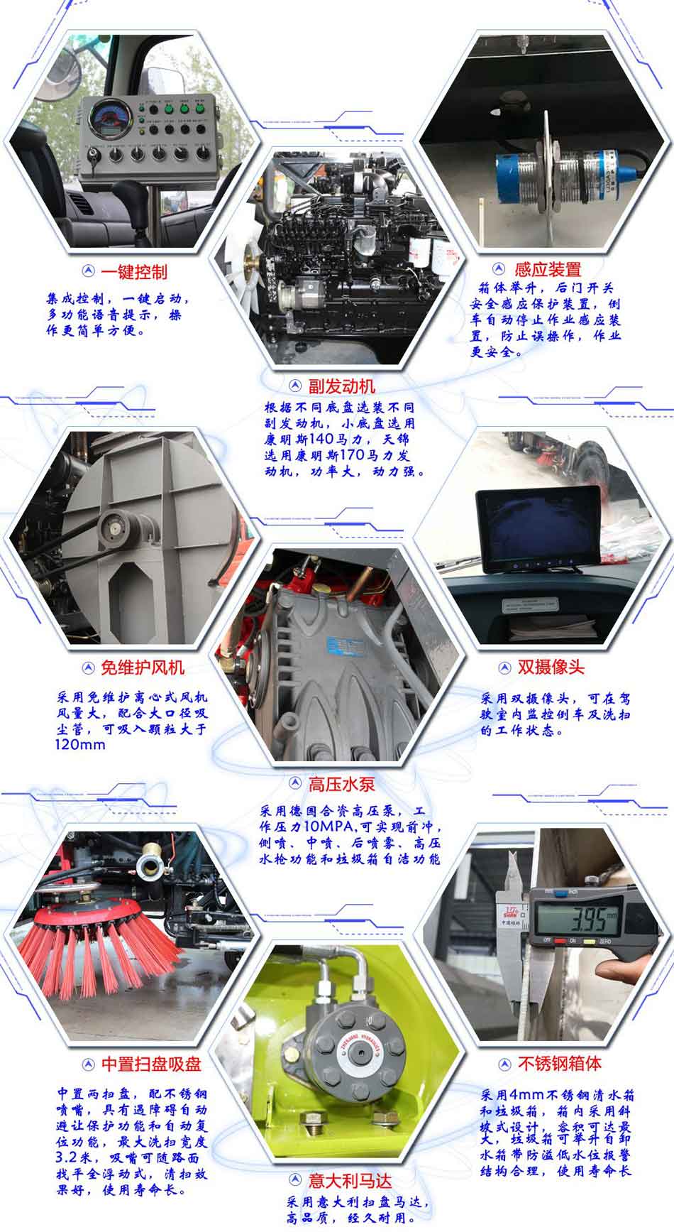 東風D9洗掃車上裝配置:帶不銹鋼箱體,容積為9立方,帶2個中置掃盤,康明斯170馬力副發(fā)動機;意大利馬達;德國高壓水泵(前沖/側(cè)噴/中噴/后噴霧/沖洗水槍/垃圾箱自潔裝置);萬向高壓路沿清洗噴頭,威龍低壓泵(前沖);不銹鋼垃圾箱;不銹鋼管高壓管路;德國控制器;韓國控制箱;PLC一鍵控制;尾部LED箭頭燈;機油、垃圾箱、水箱均帶防溢低水位報警裝置;倒車及洗掃狀態(tài)室內(nèi)監(jiān)視器。18m高壓沖洗卷盤。清掃寬度3.5m;清洗壓力10MPa;吸入粒度φ110mm。
