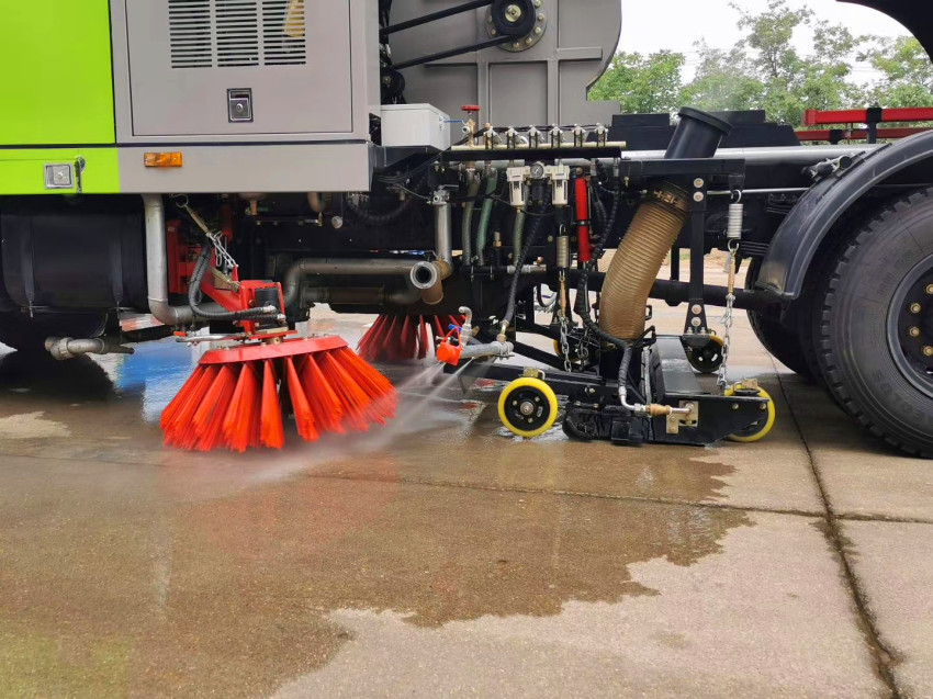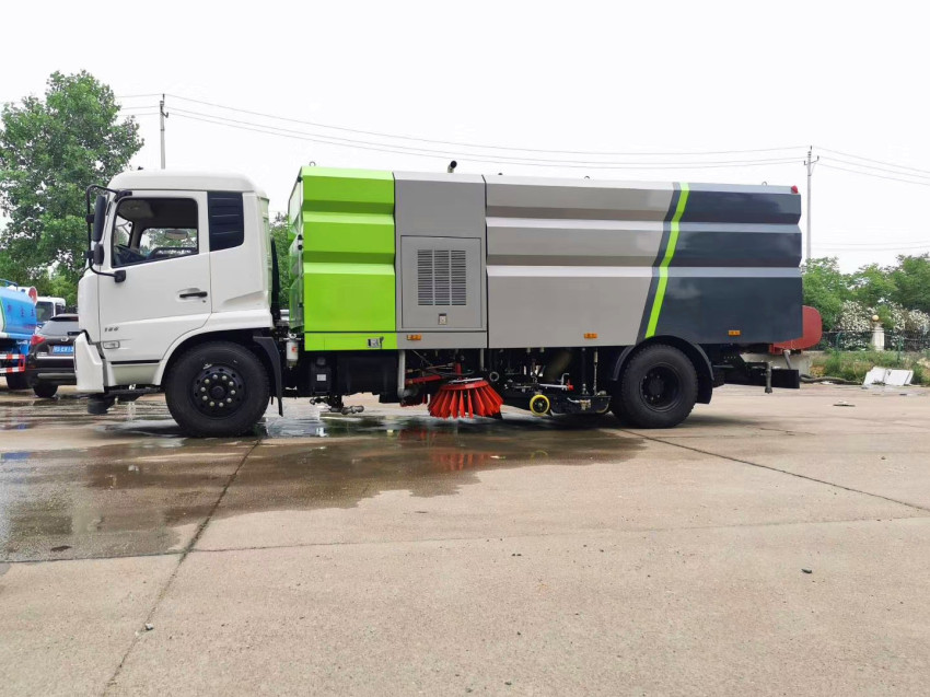該車(chē)集掃路車(chē)、灑水車(chē)和高壓清洗車(chē)功能于一體,具備路面清掃、路面洗刷、高壓清洗、低壓沖洗、路緣石洗刷、垃圾收集、污水回收、噴霧降塵和道路隔離墻清洗、小廣告清洗等多種作業(yè)功能。