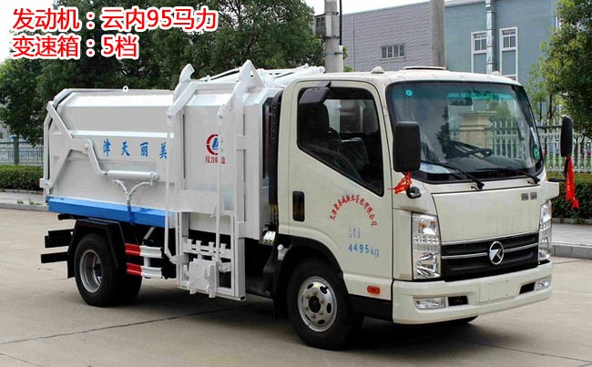 箱體容積5~6立方米,外形與掛桶垃圾車相似,箱體材料邊三底四碳鋼,內(nèi)部做防銹處理,側(cè)方帶掛桶提升機(jī)構(gòu),車尾部橡膠密封條,內(nèi)置推板,后蓋液壓開啟。