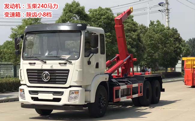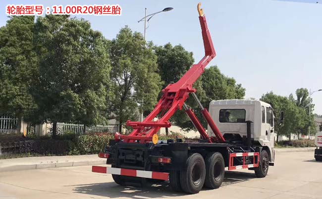 東風(fēng)后雙橋勾臂式垃圾車,齊星駕駛室,玉柴240馬力發(fā)動(dòng)機(jī),陜齒小8檔變速箱,軸距4350+1300輪胎,前橋5噸,后雙10噸,11.00R20鋼絲胎,帶ABS,下防護(hù)。