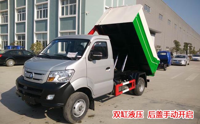 箱體容積3~4立方米,板材厚度邊3底4,箱體結(jié)構(gòu)為墻板形式,國產(chǎn)多路閥,油泵、取力器、油缸,駕駛室外部操作、箱體底部雙缸液壓舉升卸料,后門機(jī)械鎖緊、手動(dòng)開啟。