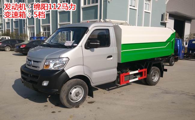 重汽王牌掛桶式垃圾車,1650單排駕駛室,綿陽112馬力汽油發(fā)動(dòng)機(jī),5檔變速箱,185R14LT輪胎型號(hào),140大梁,3噸后橋、油剎。