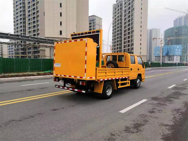 上裝配置:防撞緩沖車尾部設(shè)置防撞緩沖塊,防撞緩沖塊采用液壓升降裝置,還配備車載一體化的電子屏、電子箭頭標(biāo)志牌、頻閃燈及爆閃燈多種警示燈,能夠?yàn)楹蠓杰囕v提供警示和指示方向。箭頭指示標(biāo)志可對左、右及禁止通行進(jìn)行導(dǎo)向指示,對道路車輛提供主動安全引導(dǎo)和安全警示,最大限度降低施工對交通流量的影響并確保安全。尾部升降和燈具采用遙控控制,可在車輛附近安全控制防撞緩沖塊的升降和警示燈的開關(guān)。