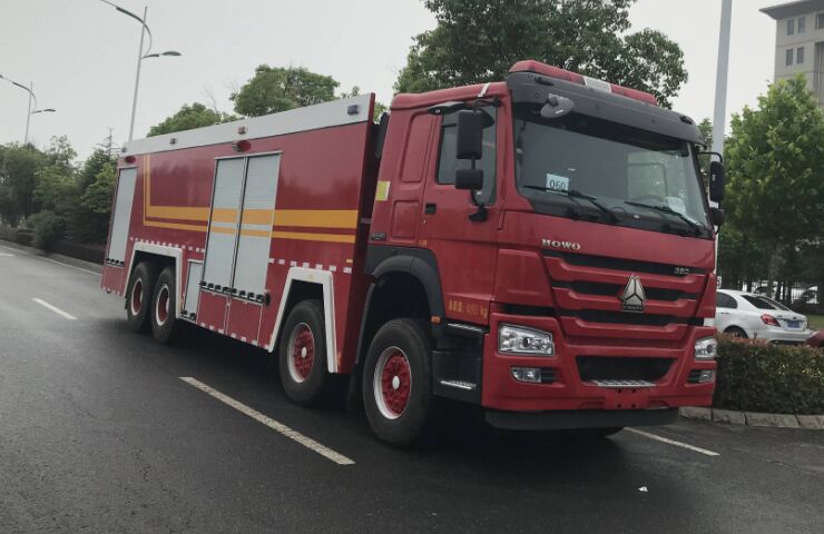 重汽豪沃24噸泡沫消防車,采用重汽豪沃ZZ5437V4667E1底盤改裝而成。整車由消防員乘員室和車身兩大部分組成,乘員室為一排半,可乘坐2人,該車為外露罐結(jié)構(gòu),車身前部為水罐,后部為泵房。載液罐體為優(yōu)質(zhì)碳鋼,與底盤采用彈性連接,載水20450kg(PM160),泡沫液量3100kg(PM240),裝備了上海茸申消防器材有限公司生產(chǎn)CB10/80型常壓消防泵,額定流量80L/S,車頂安裝成都威斯特消防機(jī)械有限公司生產(chǎn)的PL64(PM240)型車用消防炮。該車最大的特點是載液量大、操控性好、維修簡便?蓮V泛應(yīng)用于公安消防隊、廠礦企業(yè)及社區(qū)、碼頭等場所,撲救大型油脂類火災(zāi)或一般性性物質(zhì)火災(zāi)。