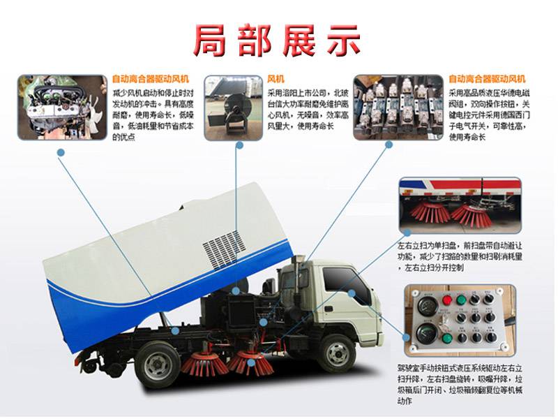 4、東風(fēng)2噸小型掃路車采用中置4盤(pán)刷+后置吸盤(pán)的清掃結(jié)構(gòu),三段式工作,清掃效果更好。