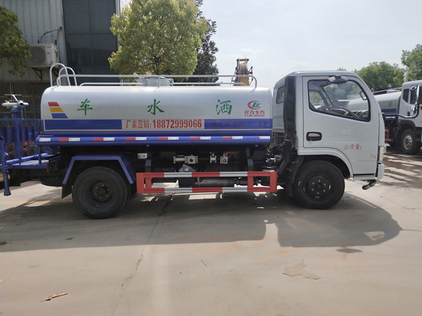 新款5噸灑水車采用東風(fēng)多利卡底盤,白色可前翻駕駛室,朝柴102馬力國五發(fā)動(dòng)機(jī),5檔變速箱,軸距3308mm,1.8噸前橋,3.5噸后橋